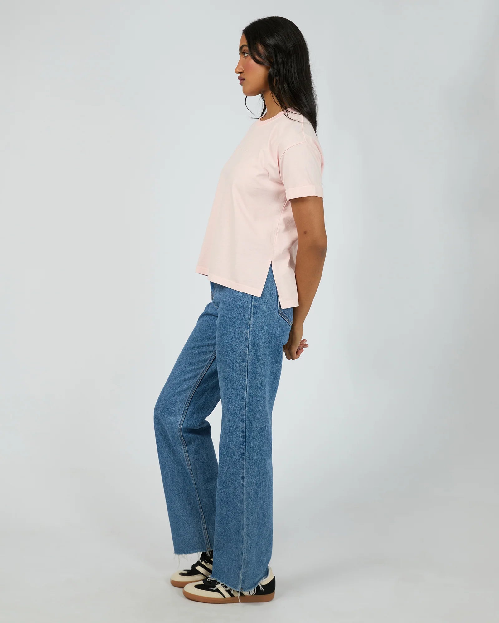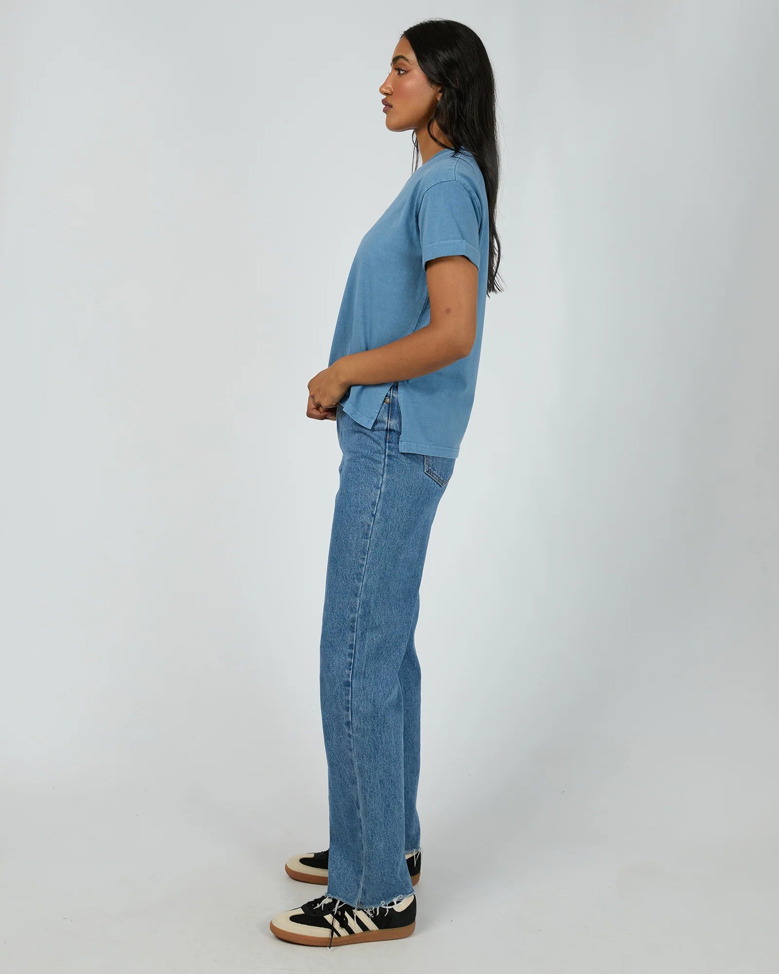 All About Eve Washed Tee features a garment wash with a branded chest embroidery. Styled back with denim jeans and sneakers for a chic weekend vibe.