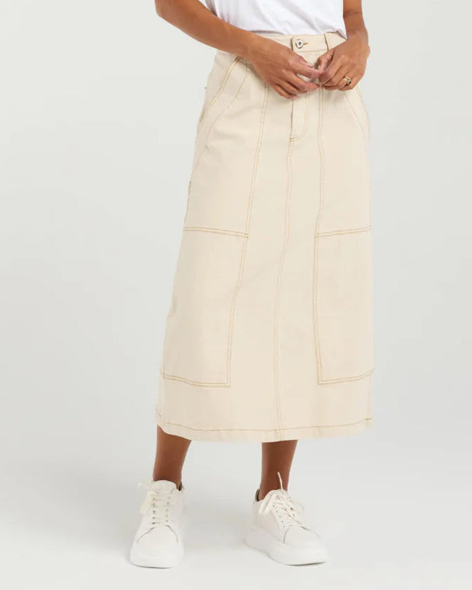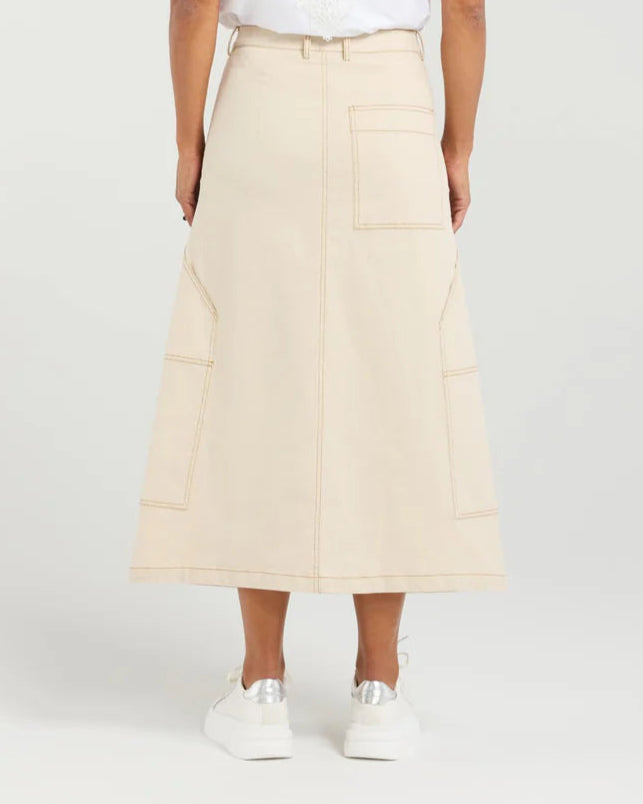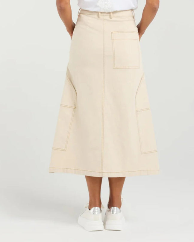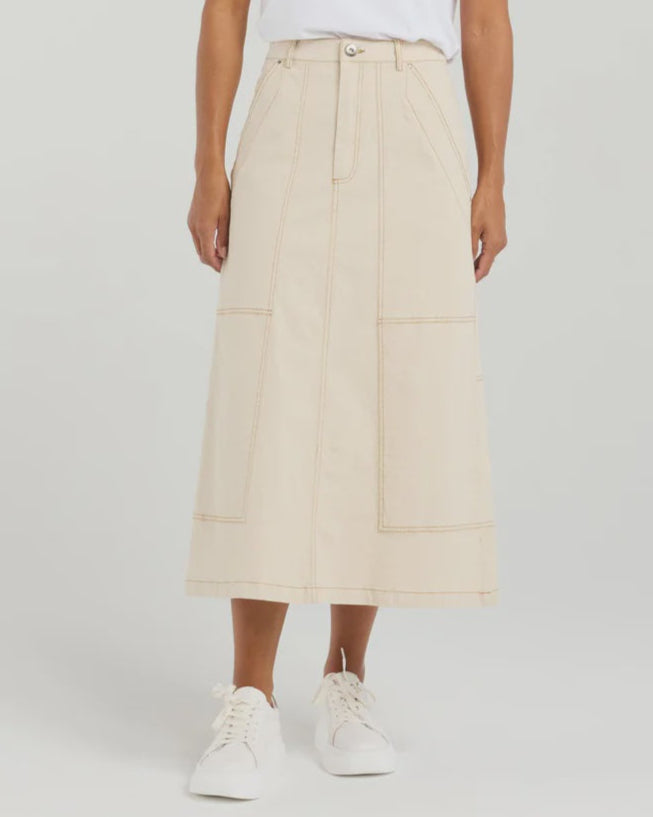 A fresh interpretation of a wardrobe staple, Avril skirt is a mid-length A-line skirt which channels the spirit of denim in a non-denim fabrication for a lighter, more refined feel.