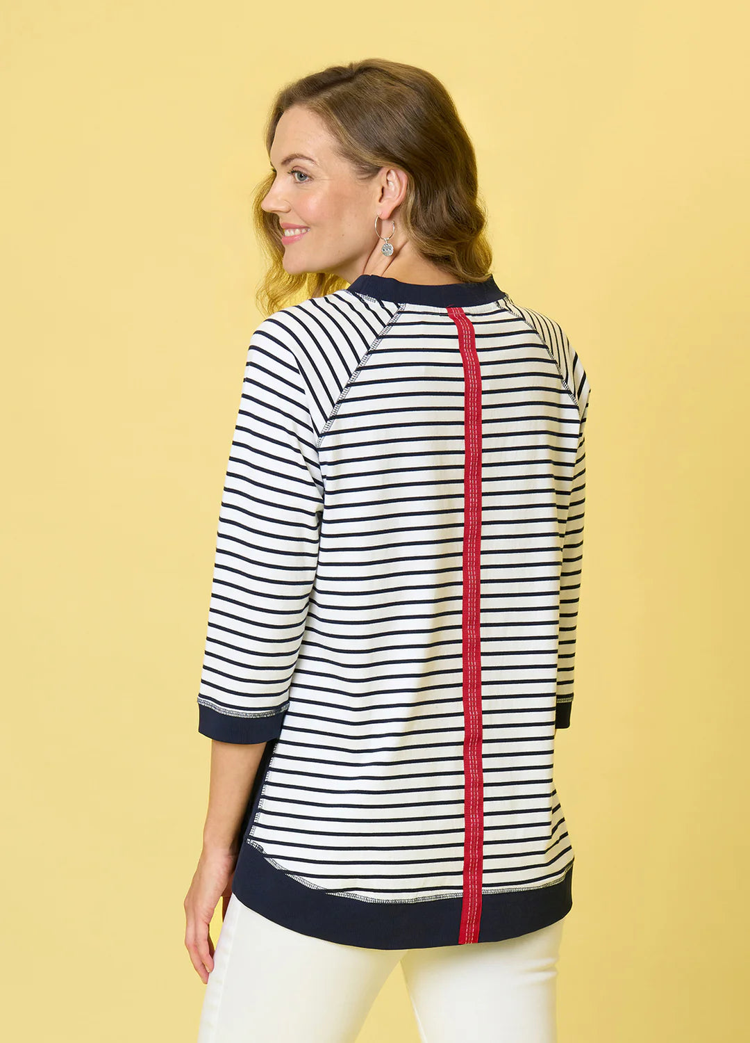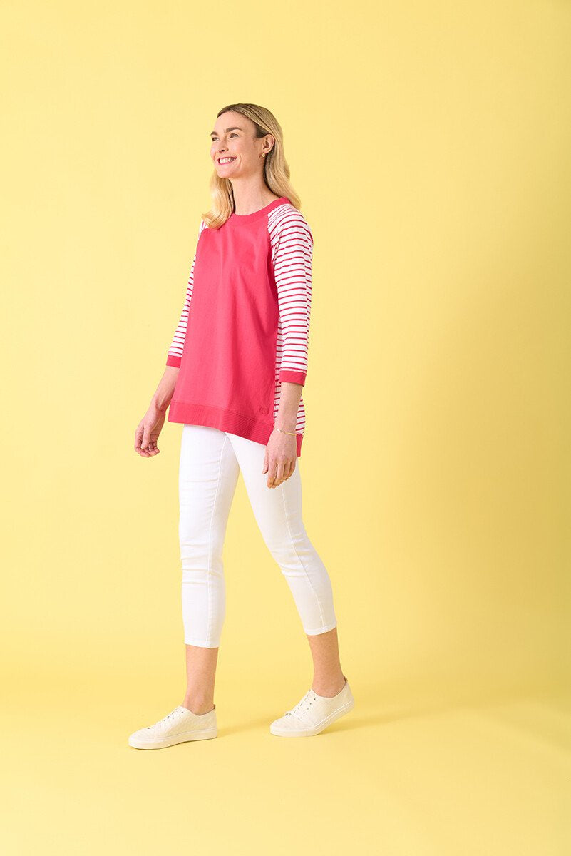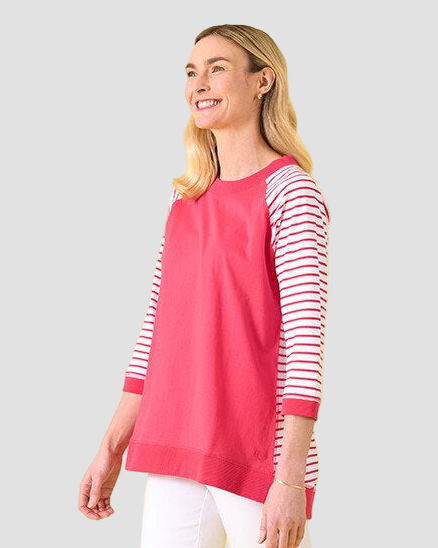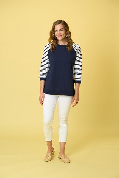 Bluff Crew from Charlier Jane is a relaxed fit raglan top. 3/4 sleeves and scoop neckline.