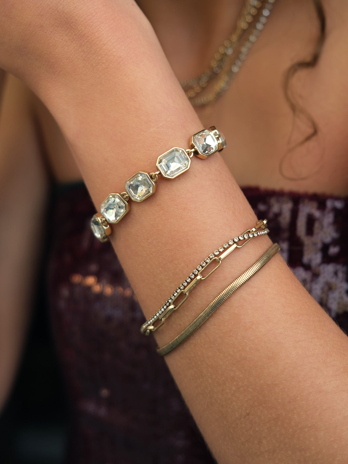 Beautiful statement bracelet from A&C Oslo with crystal clear glass stones. The bracelet has a decorative and practical toggle clasp and can be adjusted by three cm. The bracelet is perfect when you want to dress up a little extra both in everyday life and for a party!