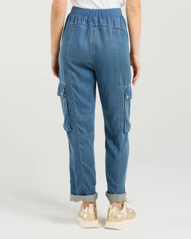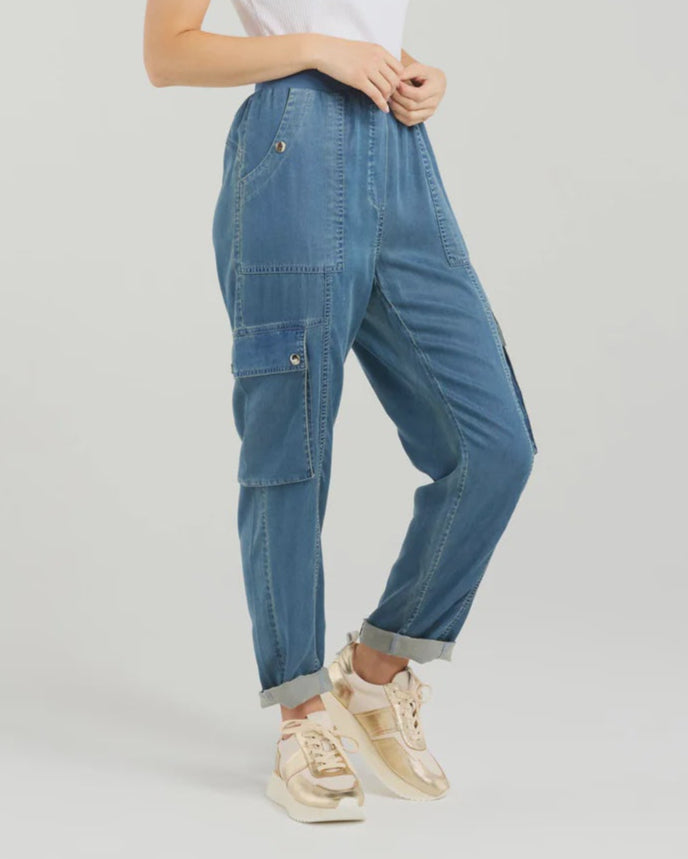 Featuring the utility pockets and hardware of the cargo style and a higher cut waist line for a flattering fit, these pants are sure to be on high repeat because of style and the lovely feel on the skin. The relaxed tapered leg line is perfect for wearing with dressy shoes, or pair back with sneakers for a modern look.