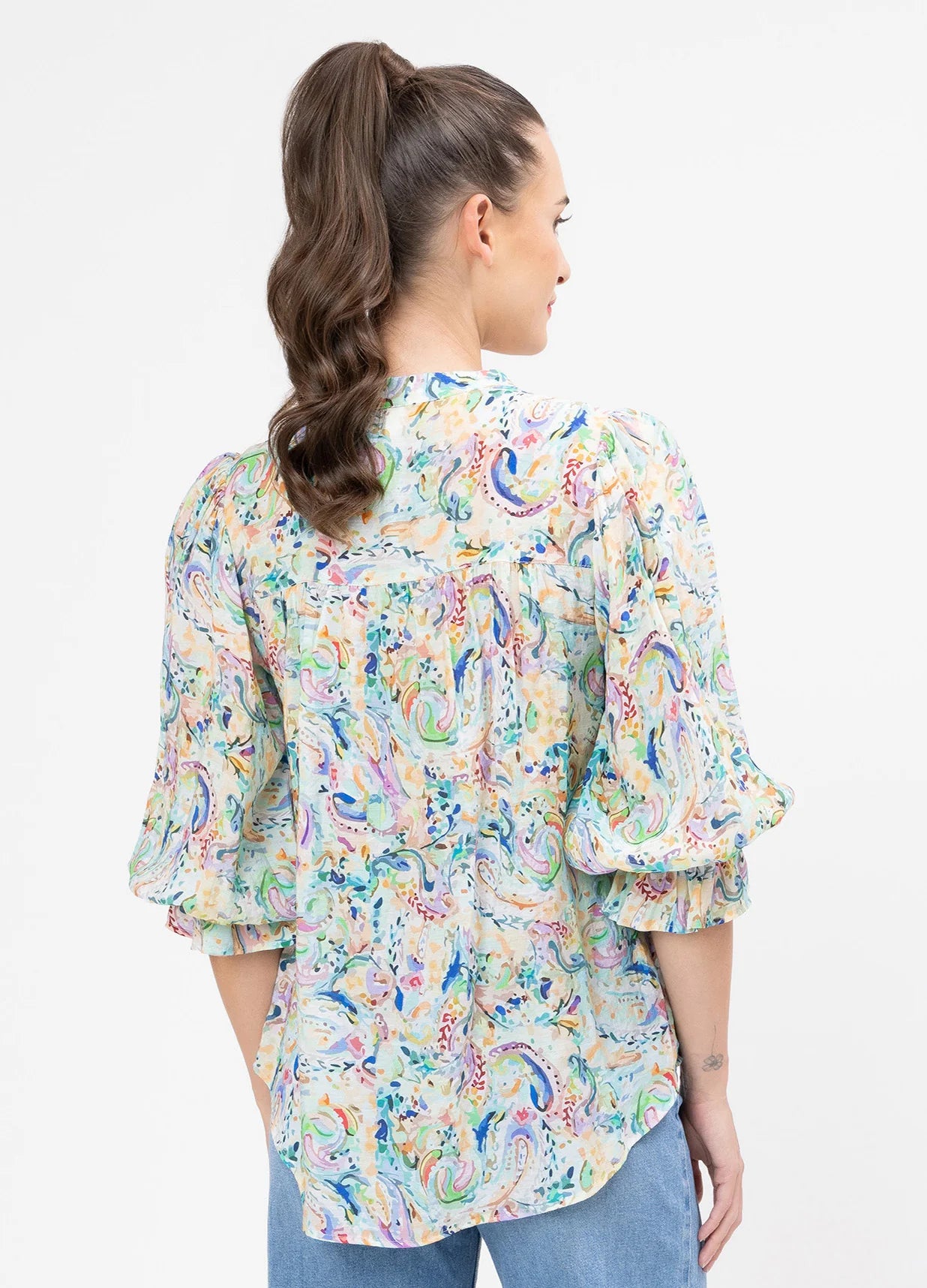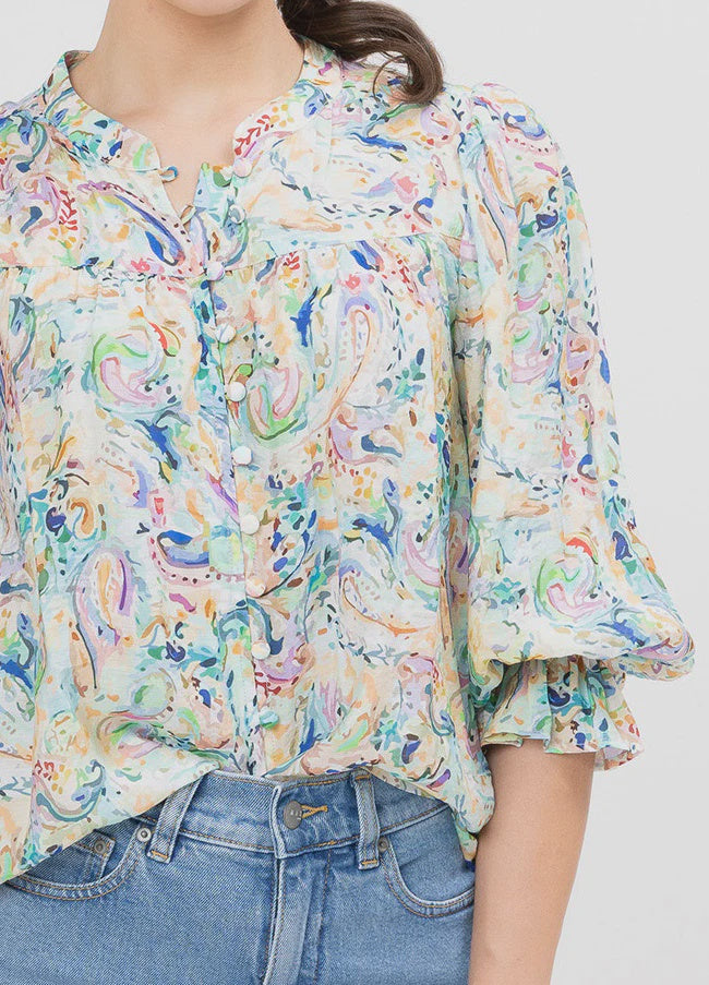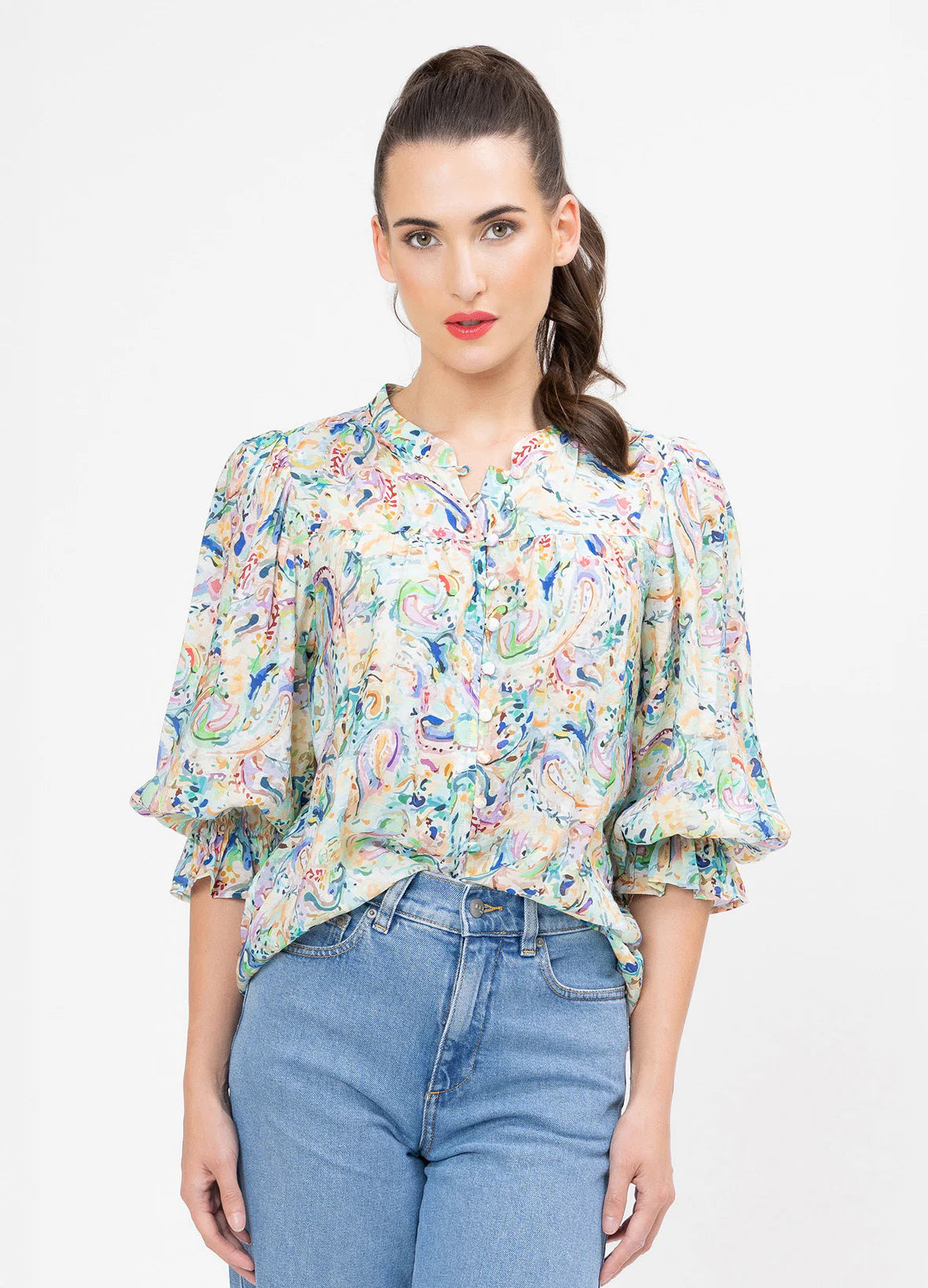 Perfect for any occasion this colourful Celia top from Seeking Lola has stylish 3/4 puff sleeves with elastic cuff details, a chic mandarin collar, and a covered button front.