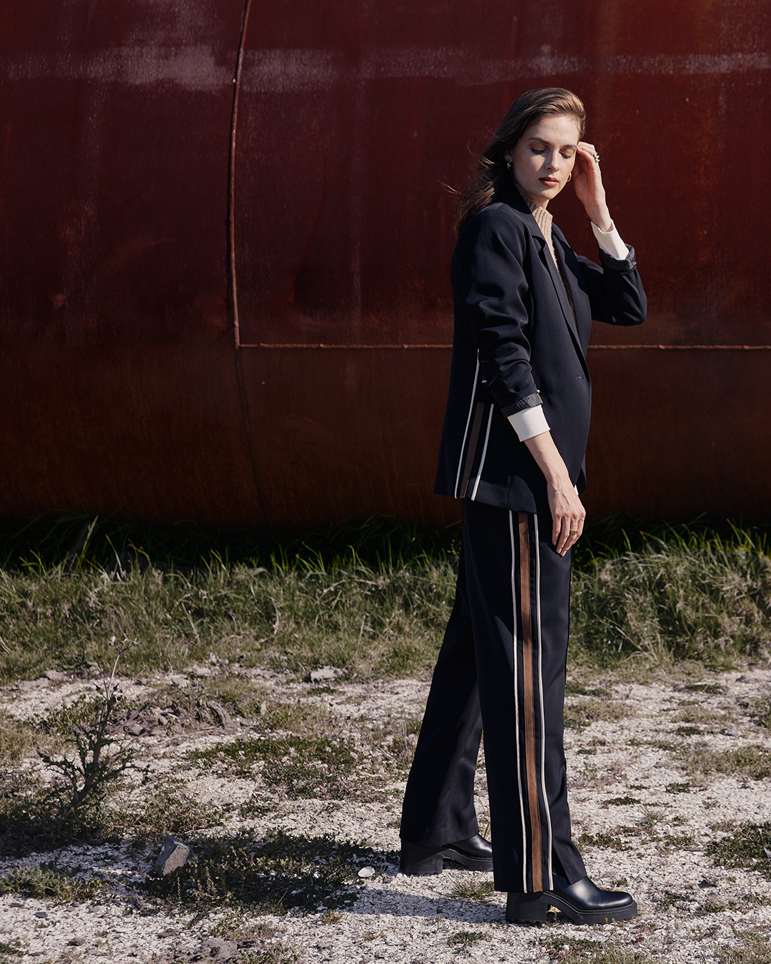 Classic double breasted tailored blazer from Madly Sweetly. Cipher has a squared hemline and back vent. Featuring contrast side panels and pocket details.