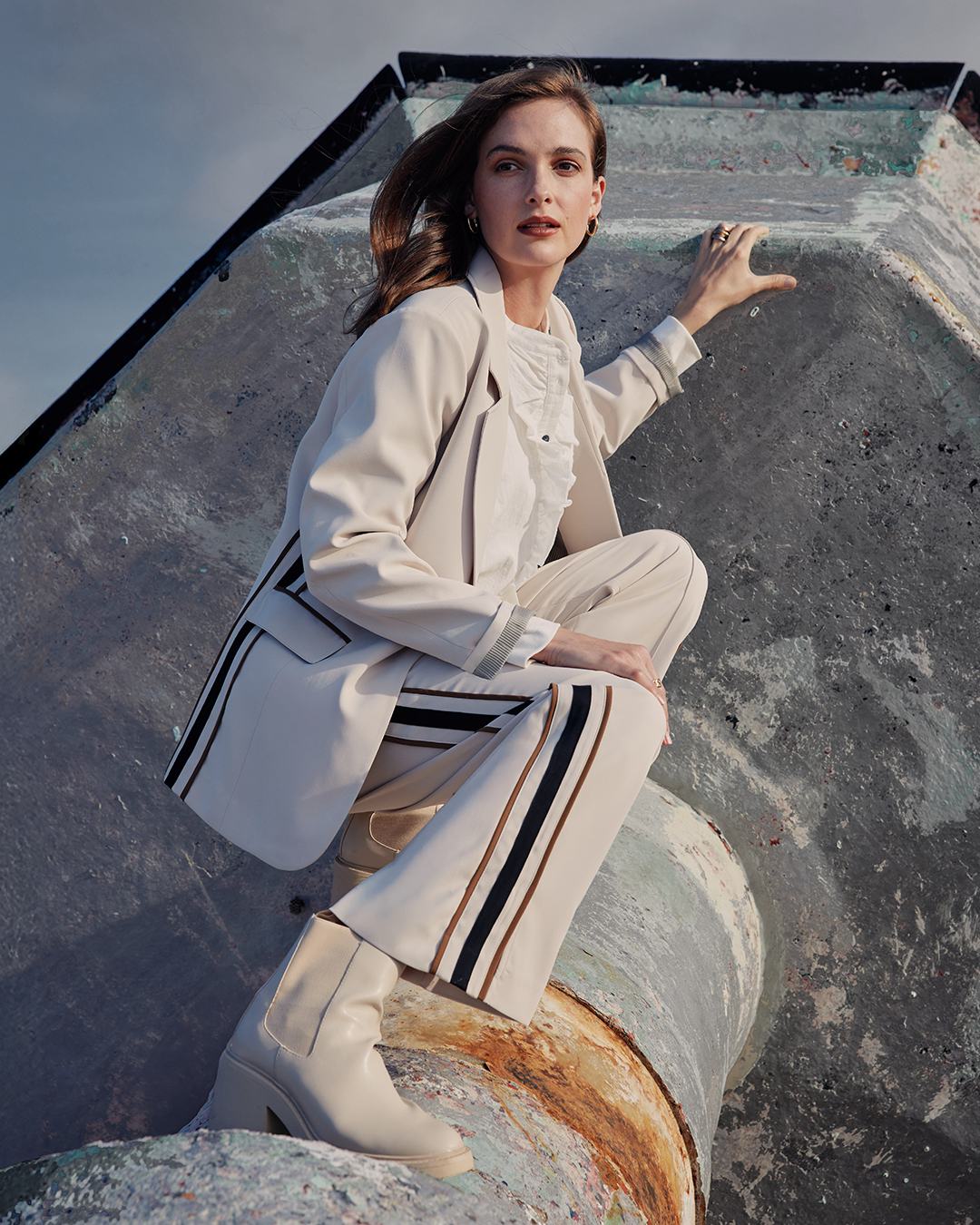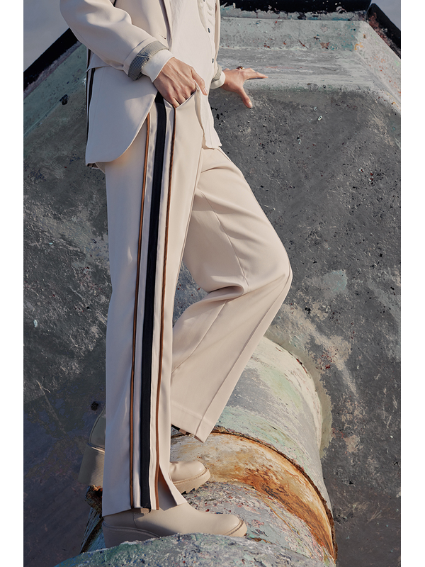 Cipher Pant will be a season fav, its striking. A straight leg pant with elasticated waistband and split at front hem. Featuring front pin-tucks and contrast side panels. Pair with the Cipher Blazer for a stunning outfit, as seen here.