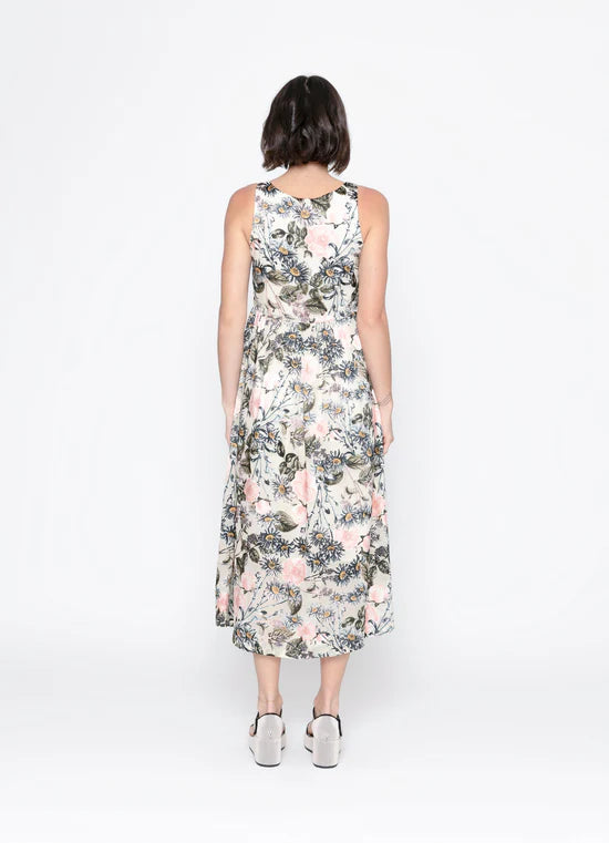 Our favorite Como Dress in the mesmerizing Eden Print of greys, apricot, olive. The midi length and sleeveless design create a sleek silhouette, perfect for any occasion. Embrace timeless elegance with every step.