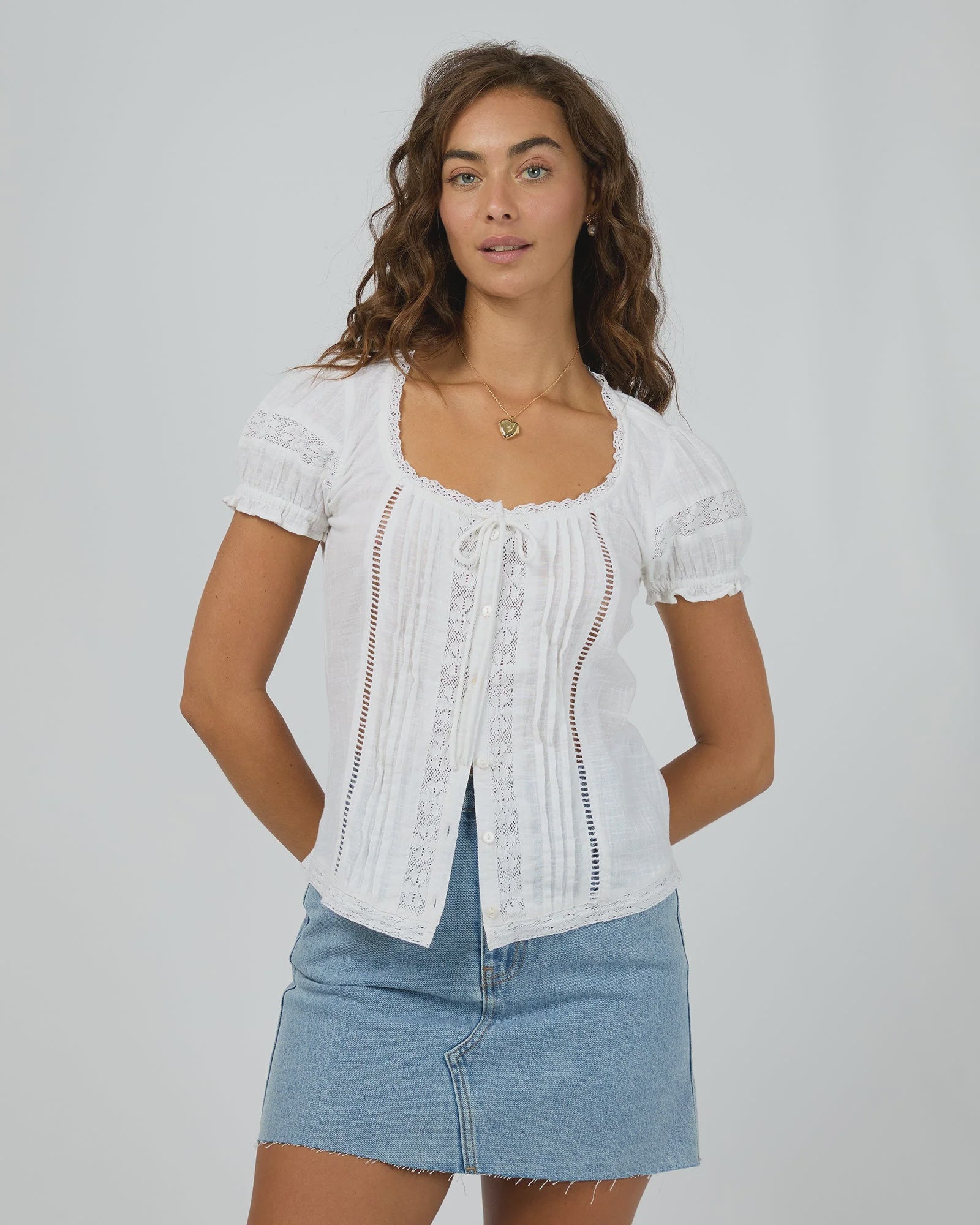 The Dusty Short Sleeve Top is a feminine staple in crisp white, crafted from breathable woven cotton and adorned with delicate lace trim throughout.
