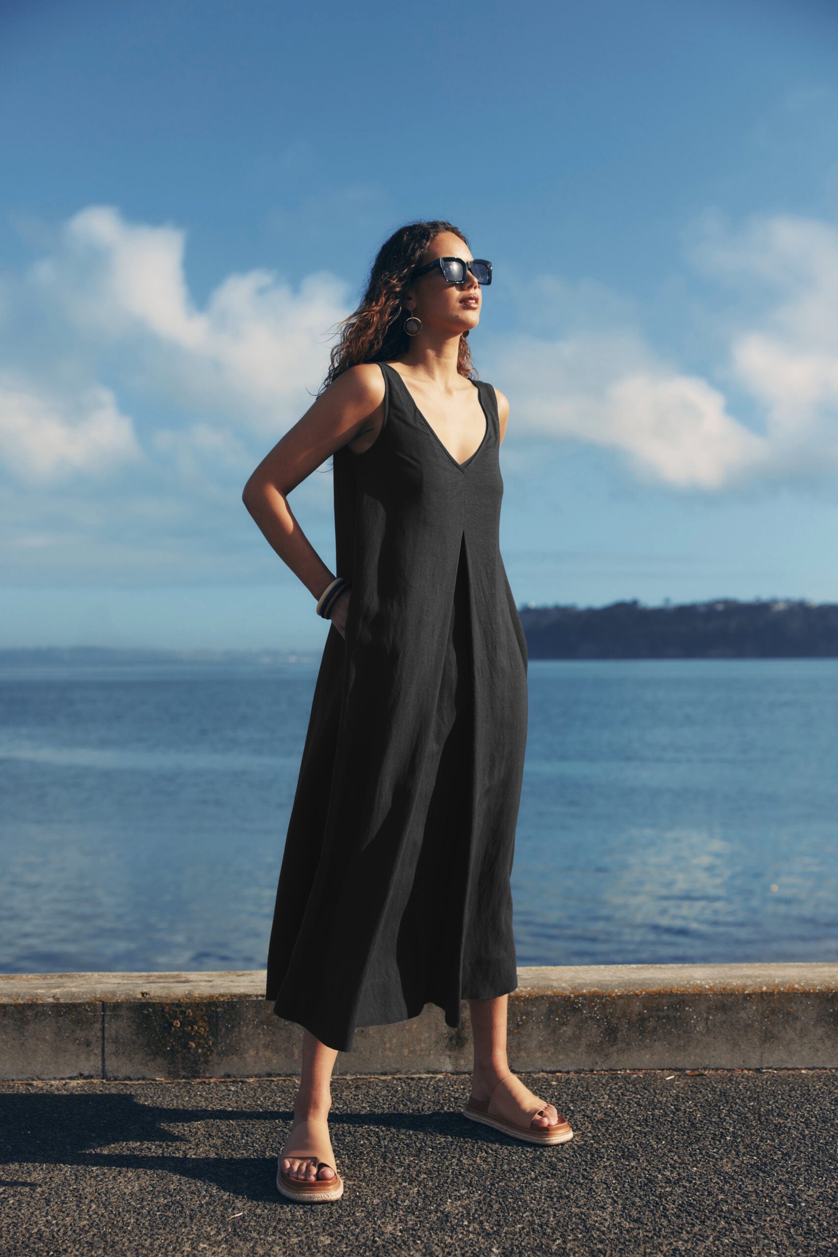 The Eclipse Maxi from Madly Sweetly is an A-line maxi dress with a V-neckline. Added fullness, and a centre front pleat with side seam pockets.