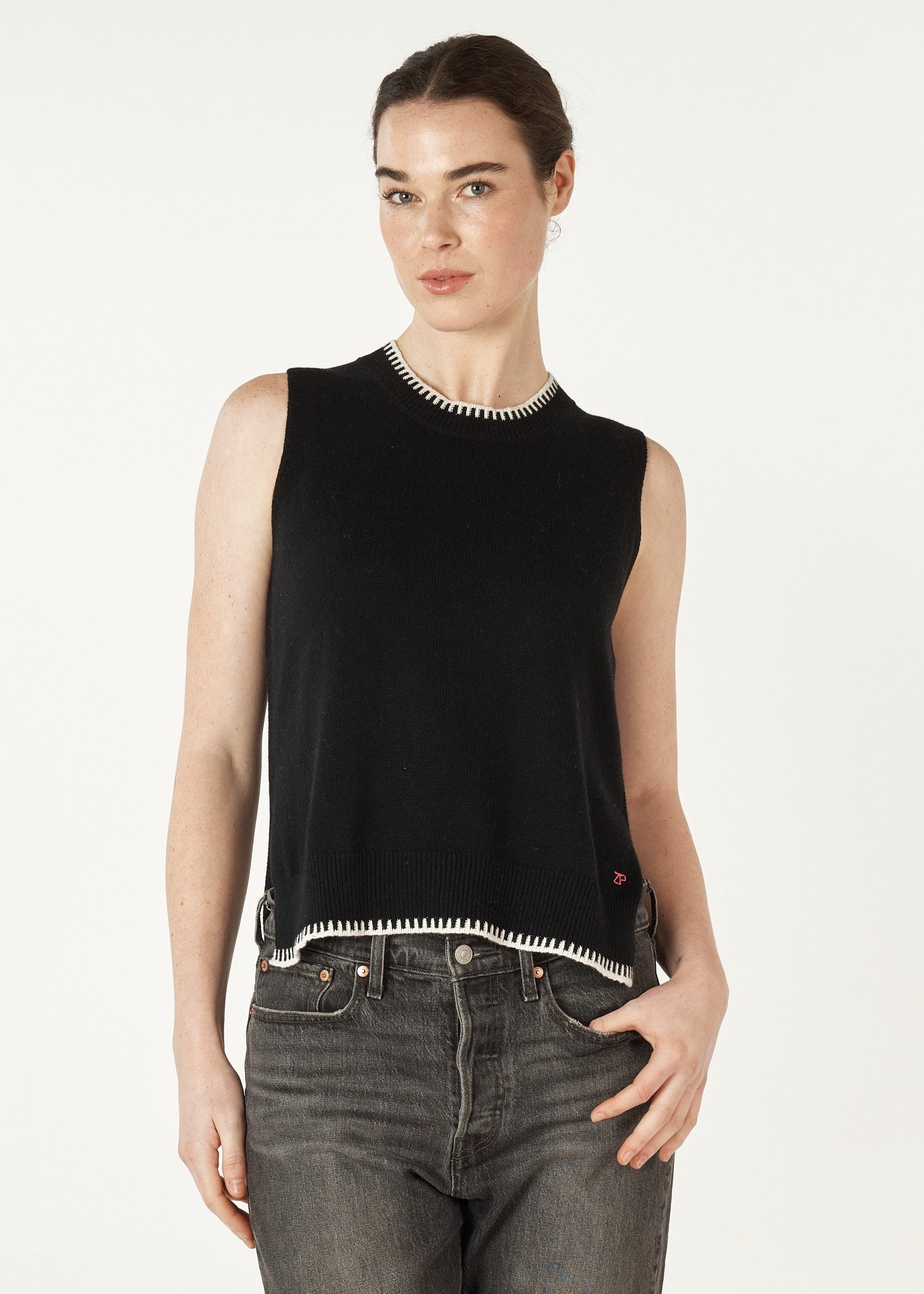Very cool vest from Z&P that will be a firm favourite this season for layering with. Black with white blanket stitching on the neck and hem. Relaxed fit.