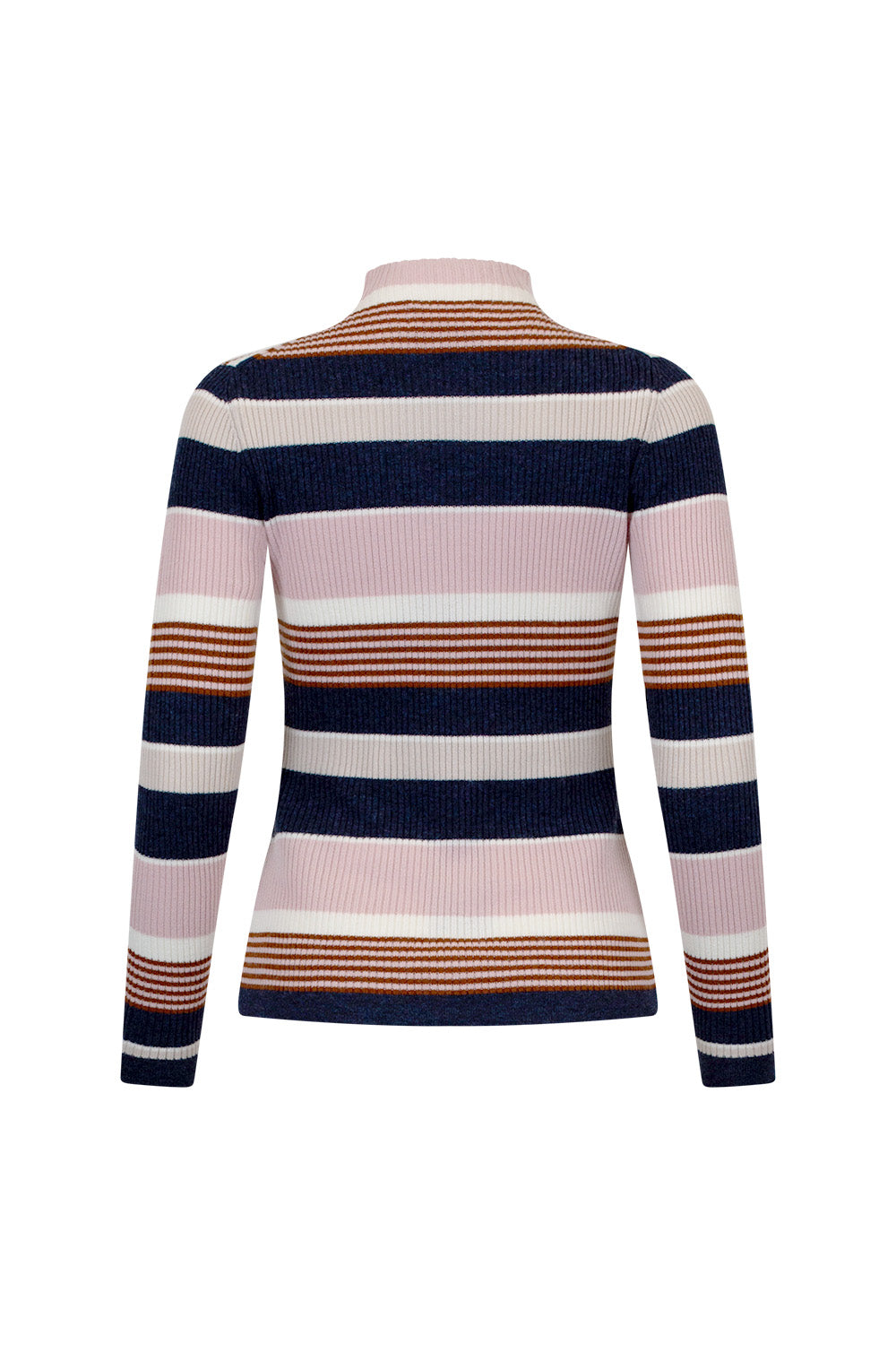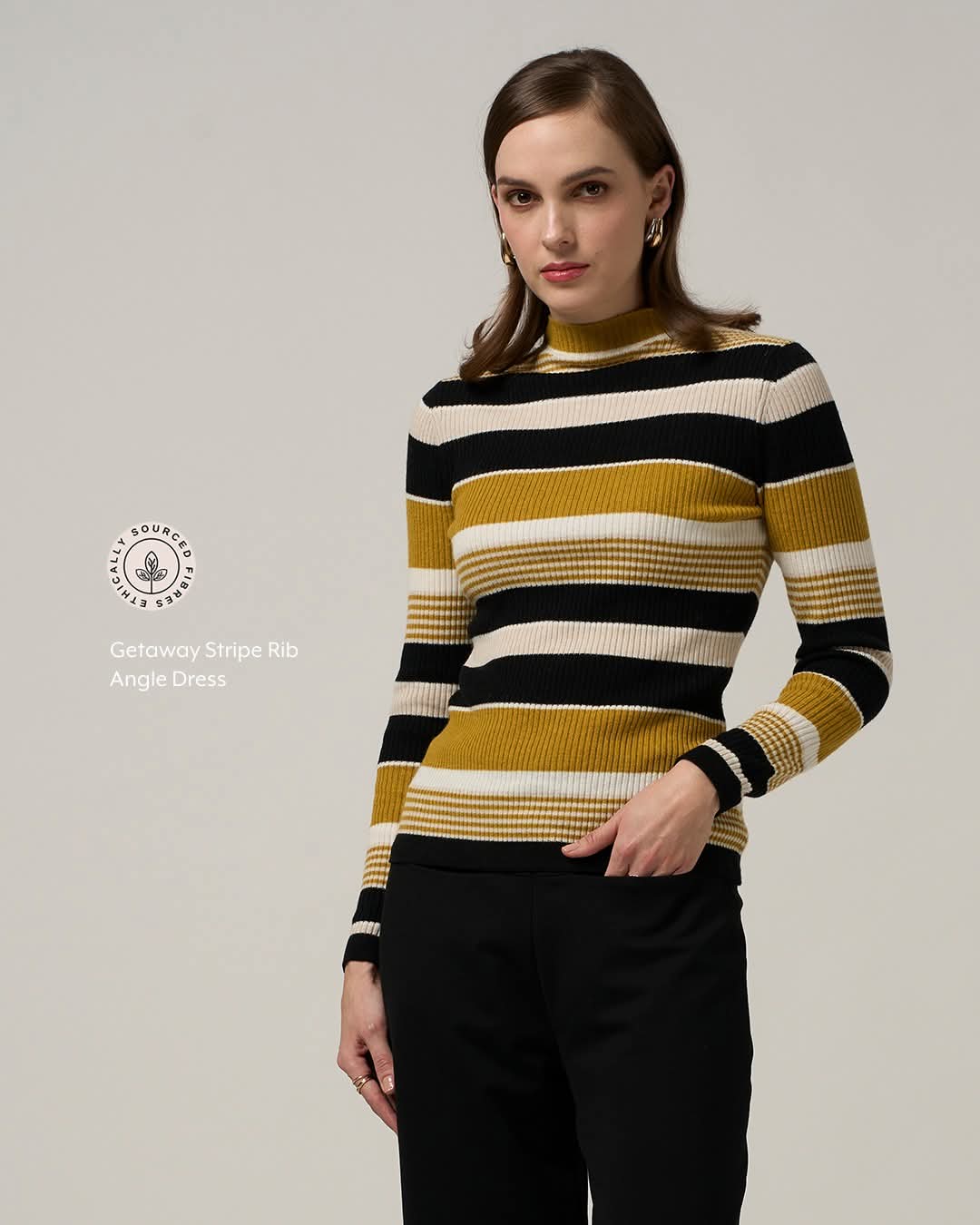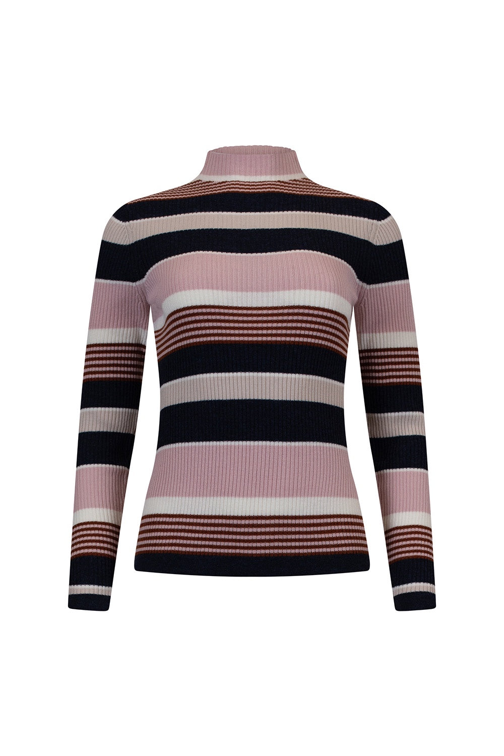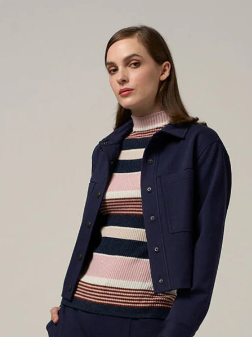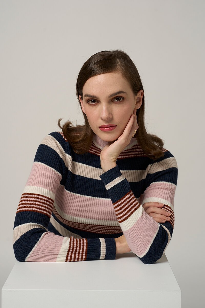 The Gateway Stripe Rib from Madly Sweetly is a Turtleneck fitted long sleeve rib. In a cashmere, merino blend. Perfect as a base layer.