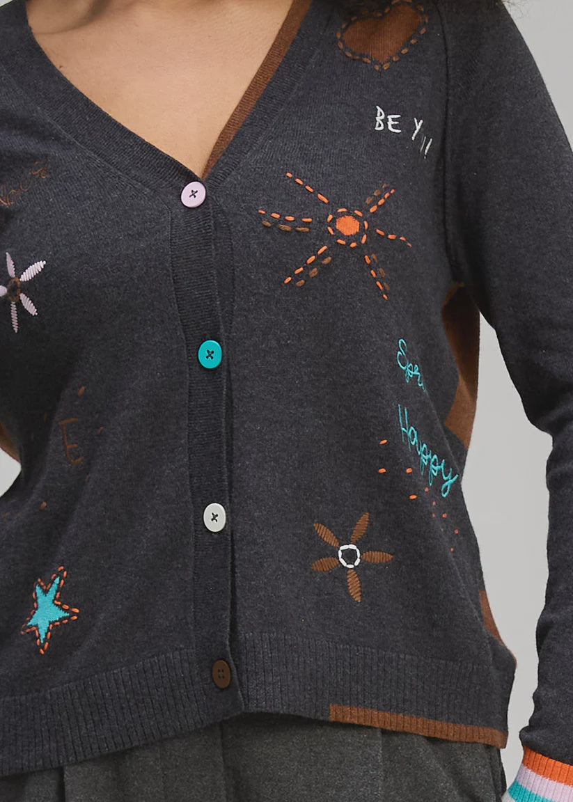 Featuring a classic button-up front, this standout cardi is brought to life with fun, youthful statement stitching and doodle-inspired patterns throughout. The charcoal base is elevated with vibrant pops of colour on the hems and asymmetrical patterned cuffs, while a striped back adds unexpected contrast and visual interest. Modern, playful and full of personality, this piece is perfect for layering with a creative edge.