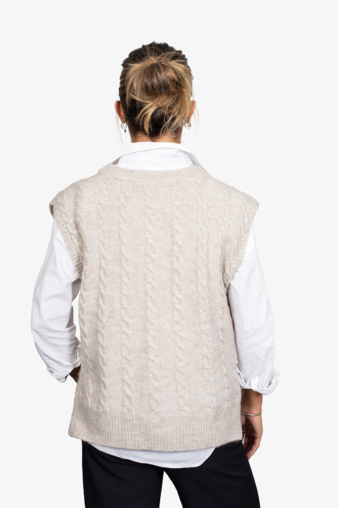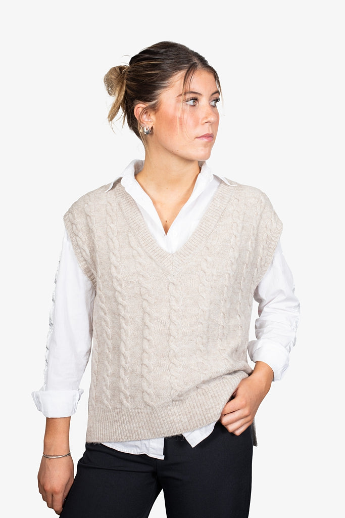 Very similar in shape to their Charlie vest from last summer, this one is a wool mix and lovely cable knit. Deep v neckline.