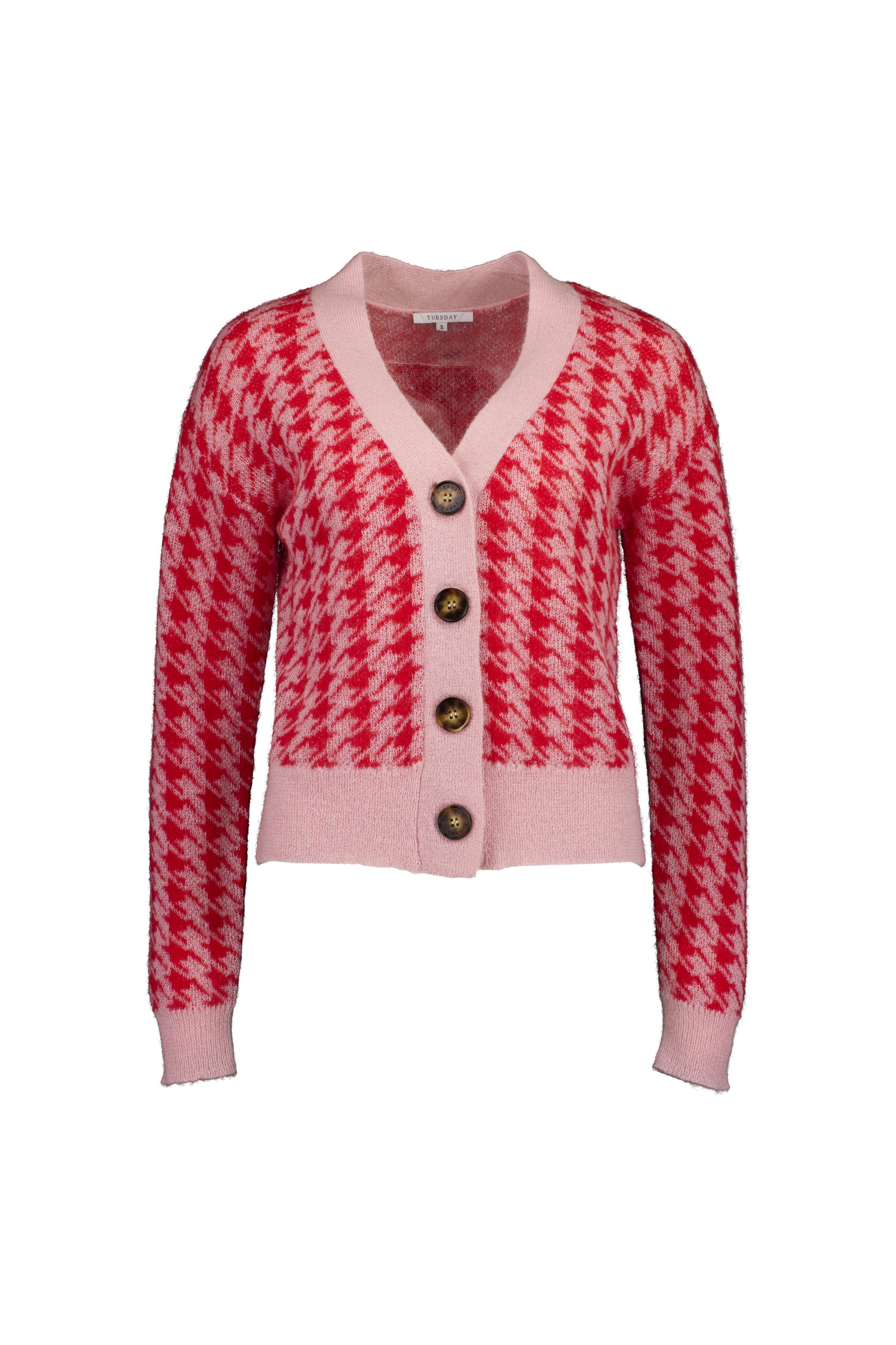 Back by popular demand, this pink & red houndstooth knit is even better in person.