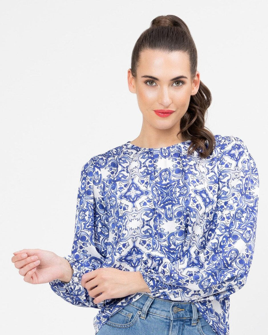 Simple and classic round neck, elastic at the cuff, centre back neck fastening with covered button, all signature looks for Seeking Lola tops.
