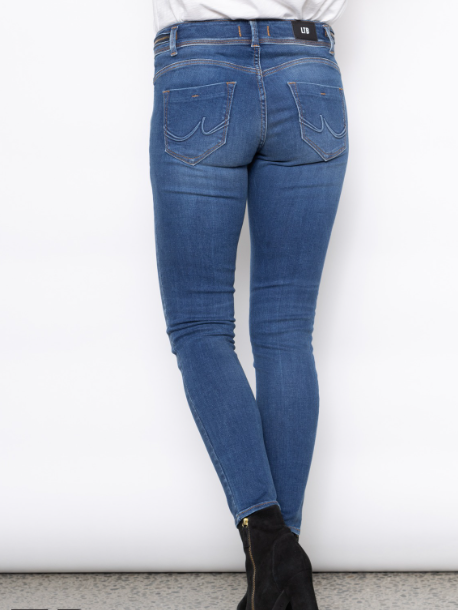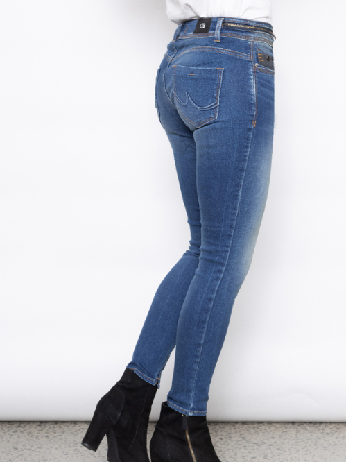 Jolina is yet another favourite LTB style. Zip fly and flattering back pockets which are designed to give you shape, fun zip detailing on the waistband, rivets, feature contrast coin pocket and in a nice mid blue colour with subtle wash down the centre of your thigh for a flattering look.
