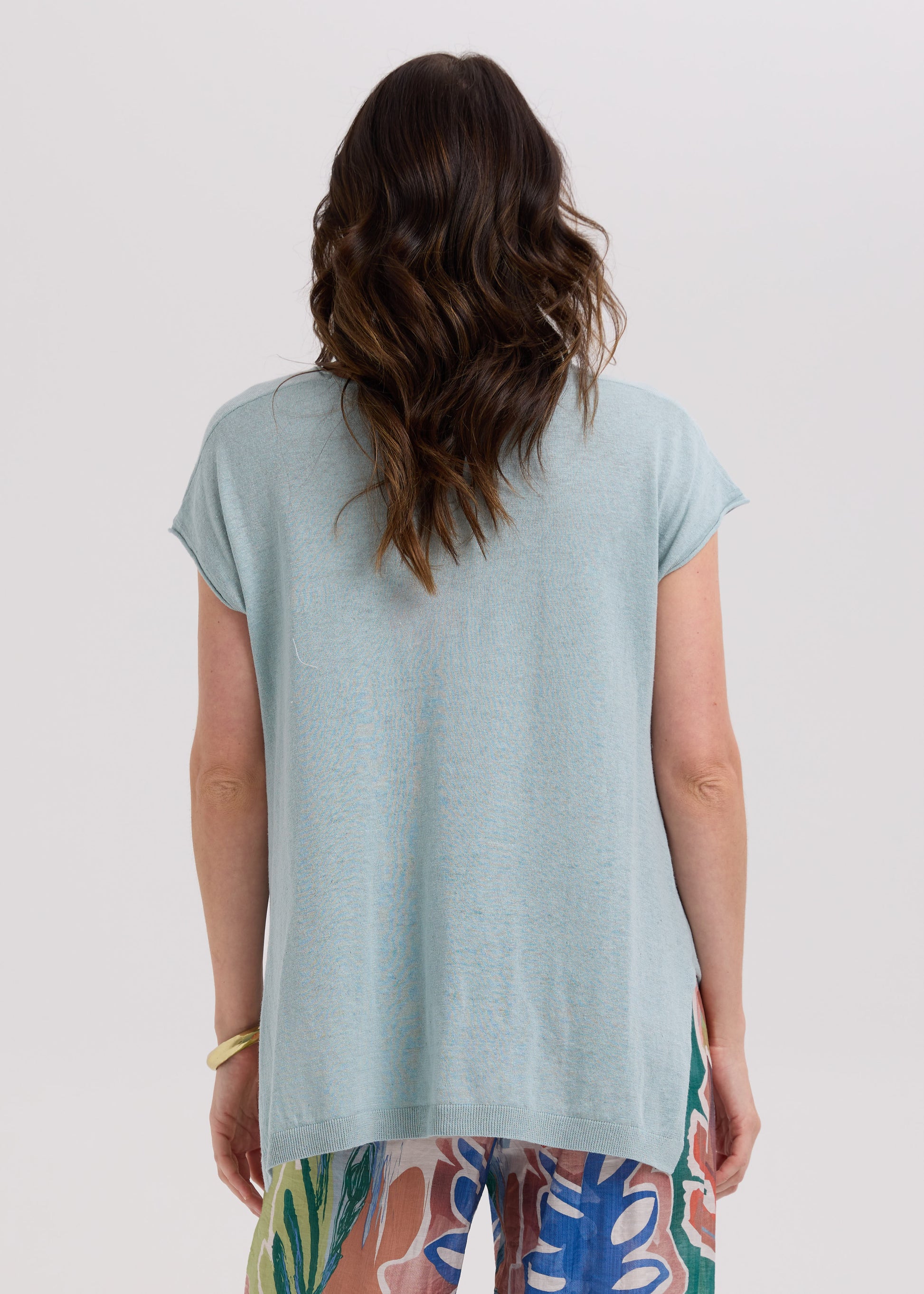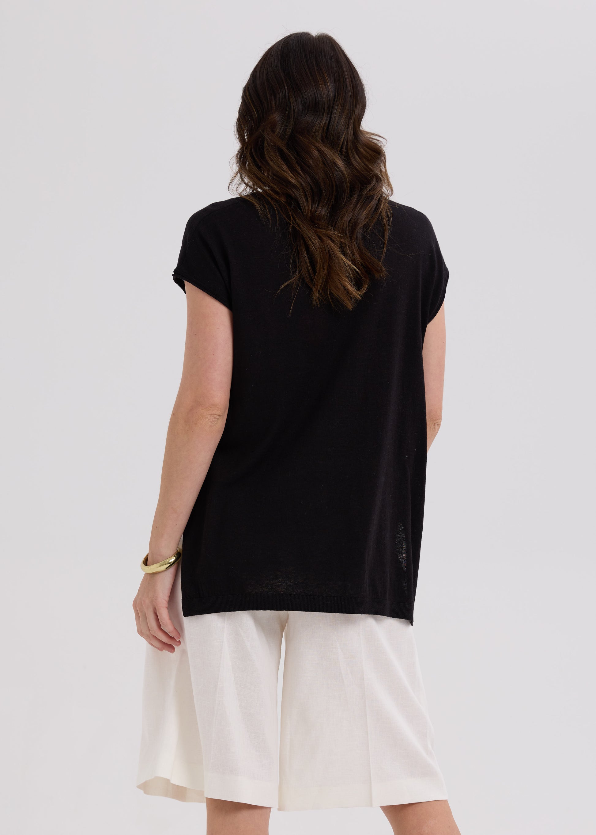 Designed with a relaxed fit and subtle cap sleeves, it offers a laid-back yet elegant look. A center front seam adds structure, while the asymmetrical hem and lightweight knit fabric enhance its easygoing, stylish appeal — perfect for effortless everyday wear or casual outings.