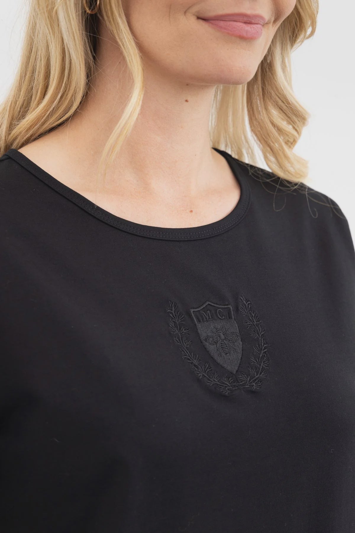 Mi Moso's Logo Tee in black. Features MOSS crest in self colour embroidery on the front and pip tag, crew neck, relaxed fit in a slightly boxy cut, finishes at the hip.