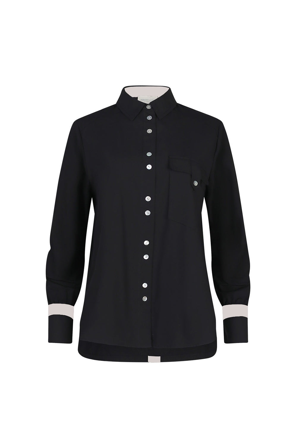Mixed Media shirt from Madly Sweetly, is a classic shirt with a light stretch jersey contrast on the back yoke and sleeves. Featuring herringbone contrast on cuff, down centre back, and inner collar.