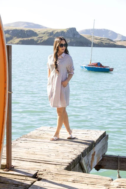 The Piper Dress in Candy Apple from Knewe is an easy summer throw-on, cut in a crisp pink and green striped cotton-blend. With pleat detailing and soft raglan sleeves, it has a relaxed charm that makes everyday dressing feel a little more fun.