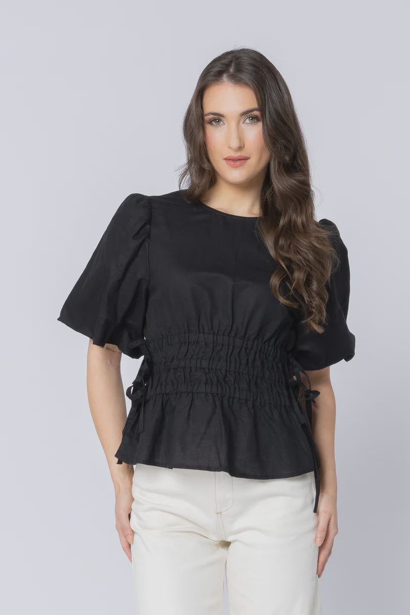 crew neck, short sleeves, 3 elasticated rows to give shape on ribs, tie details at side seam inline with the rows, suits high-waisted pants or skirt.
