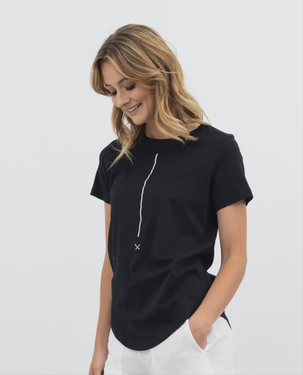 The rounded hem adds a subtle feminine shape to its classic crew neckline and short sleeves.