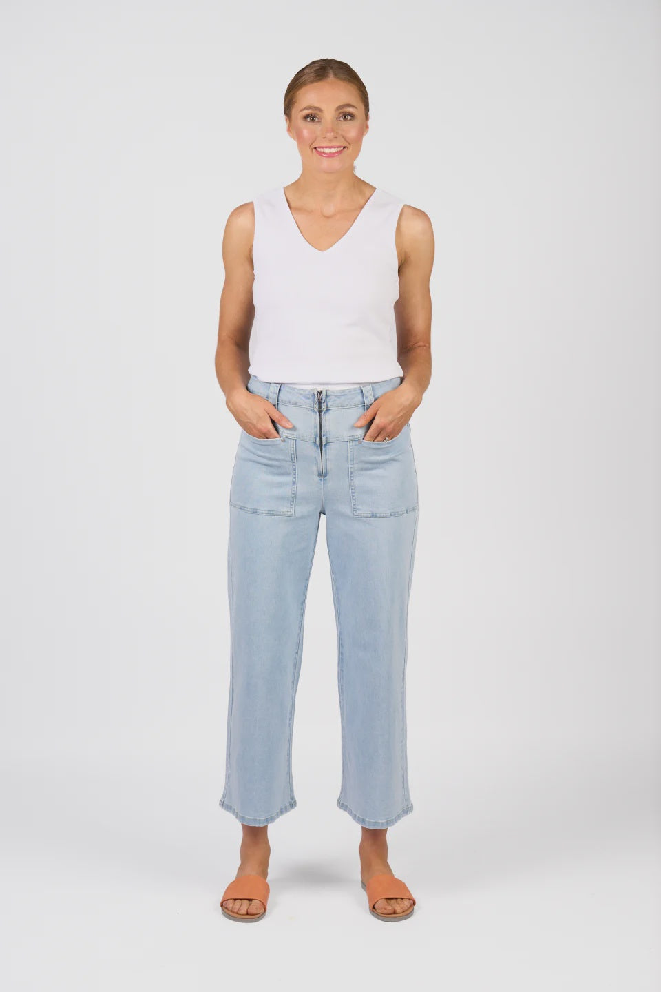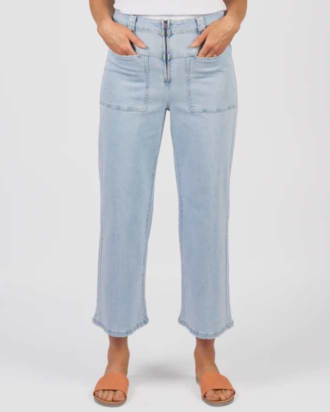 The Spin Jean from Knewe, puts a fresh spin on denim with its wide-leg, ankle-grazing cut and structured silhouette.