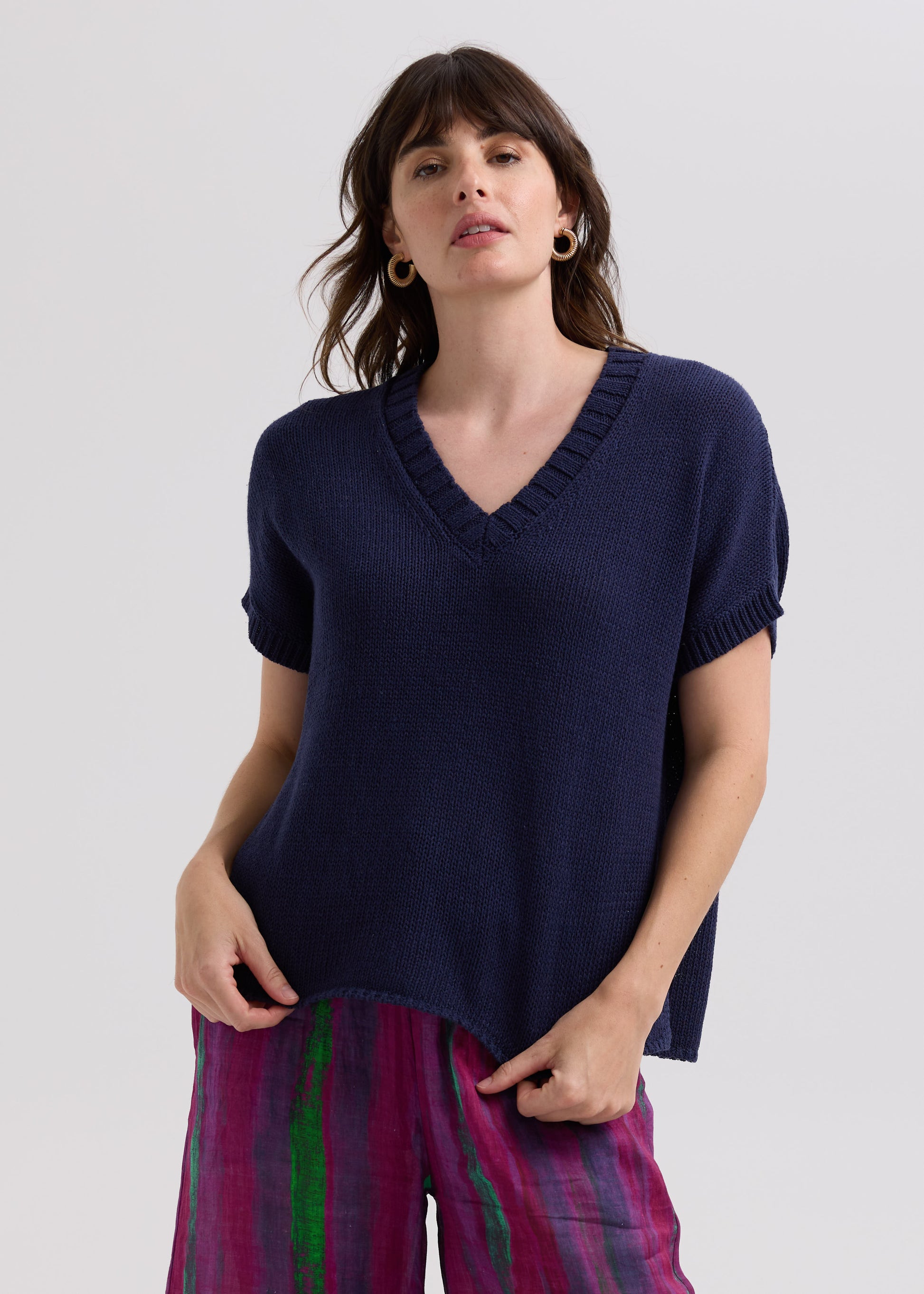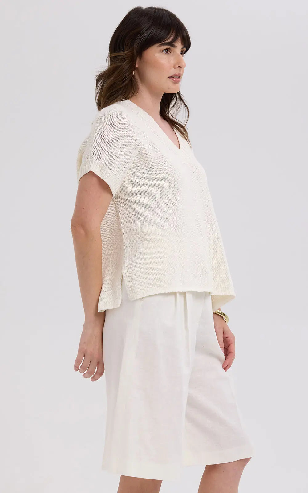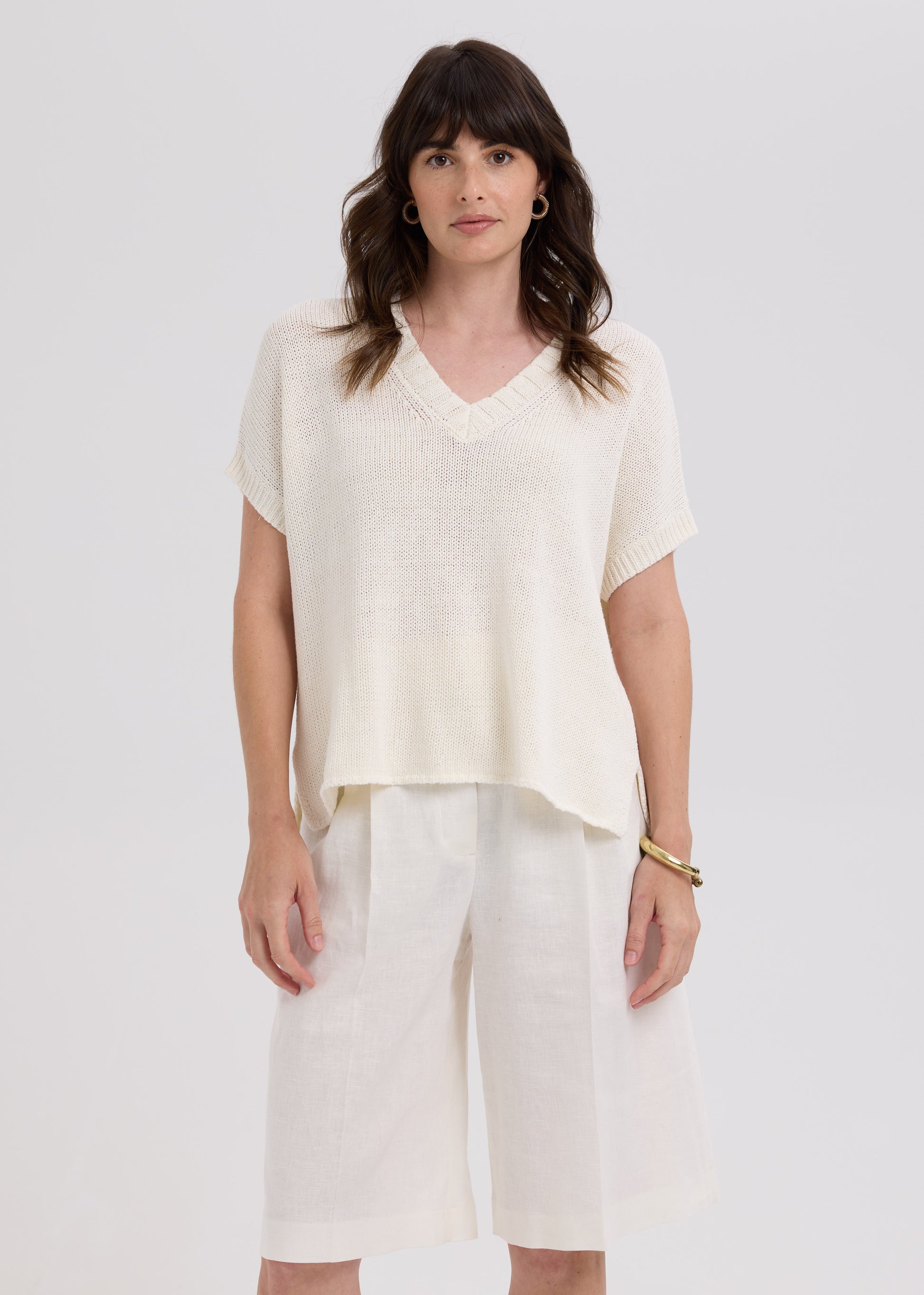 Effortlessly cool and endlessly versatile, the Textured V Top from LD + Co is a Linen Cotton blend knit with a soft V-neckline, dropped shoulders, a relaxed silhouette, and ribbed trims. Ideal for laid-back days and layering.