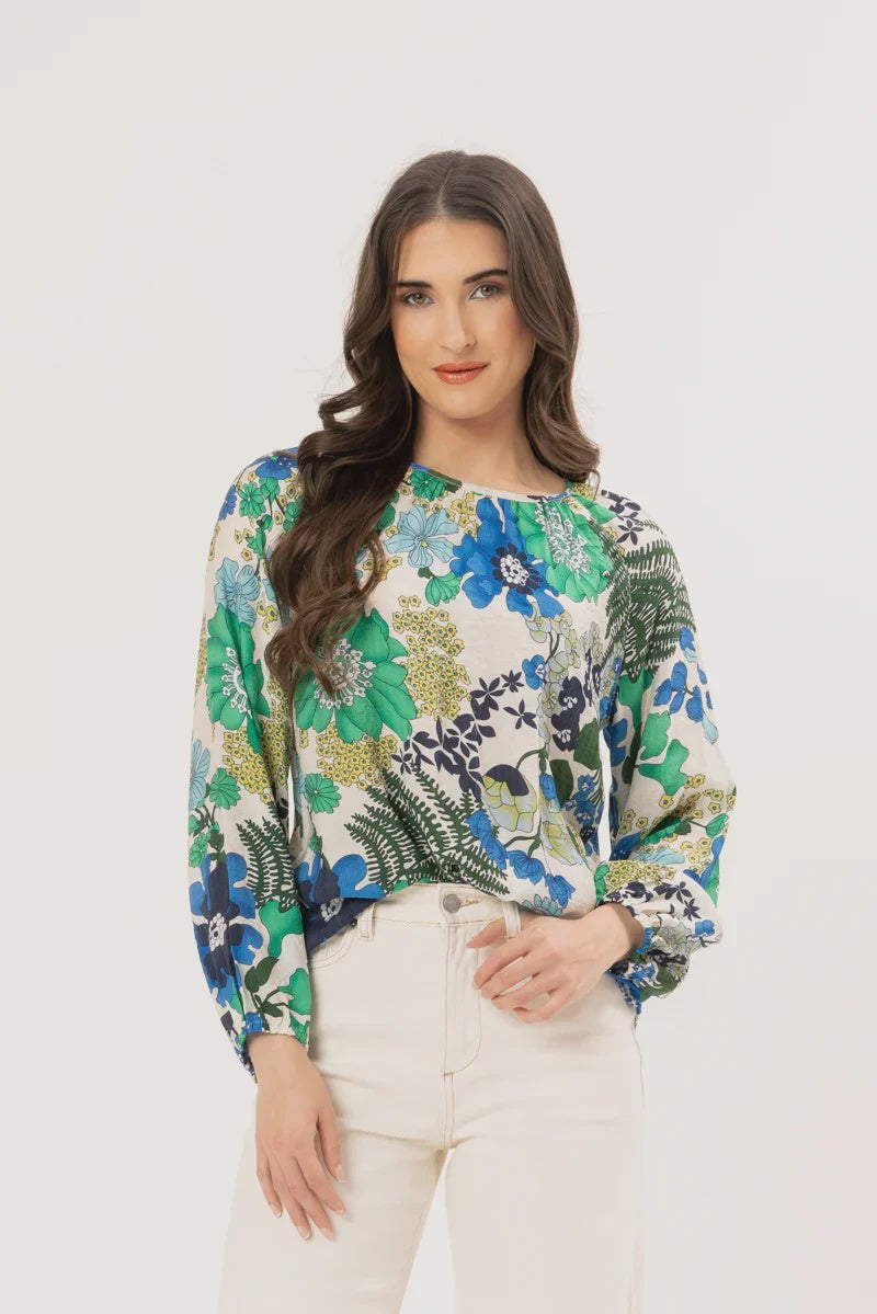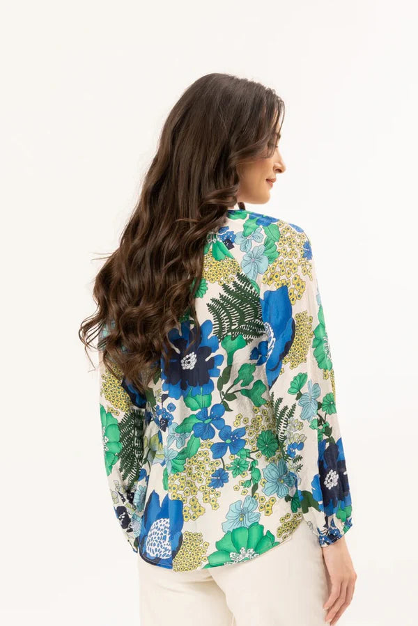 The print features a stunning mix of deep blues and fresh green tones, bringing a calm yet elevated feel to your everyday wardrobe. Easy to dress up or down, its versatile throw-on-and-go style will have you reaching for again and again.